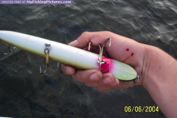 | I can feel your pain on that one! I landed a 45 incher from shore last september. When I went to remove the Cisco Topper, I lost control of the fish and it kicked its head up and burried the front treble hook into my right pointer and middle fingers! That wasn't fun since I'm right handed!!!! | |||