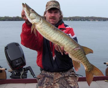 Posts: 2691 Location: Pewaukee, Wisconsin | Muskie fishing on Pewaukee was outstanding. My brother and I caaught 4 fish and raised 6 others. The first fish came at 5:30am only 15 minutes after we set up the sucker rods. I told Greg to take it and the first legal of 2005 was boated. This 38 1/2-incher went nuts after the hook-set and provided plenty of excitement as it got light out. The second fish(Gregs also) came on a rattle trap around 7am. I had to wait till 2:30 for my first fish. I stuck a 38-incher on a sucker after it came in on a glide bait. Less than a hour later I stuck a 37-incher on a twitch bait. Jason Smith and Fred scored three, all in the 36-inch range. Tuffy scored a couple fish. A couple nice fish were also caught on Saturday. A 48 1/2, 48, 45, 42 were the biggest ones that I know of but lots of the 36 to 38-inchers. Great day on the water. Today we moved 8 and caught 2 muskies, both were 37-inchers. Had a great time with all the boys who came down for the opener. Attachments ---------------- gregs38.5opener.jpg (16KB - 109 downloads) gregs37.5opener.jpg (21KB - 99 downloads) mikes37opener.jpg (20KB - 117 downloads) mikes38opener.jpg (16KB - 109 downloads) | ||
