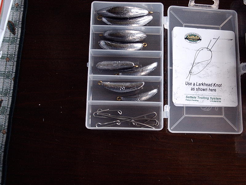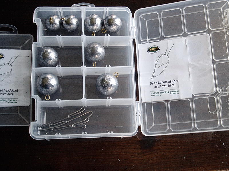 A friend of mine developed a new trolling weight system that is so simple and easy to use it's surprising no one thought of it before. He has developed two kits; one for Muskie/Great Lakes, the other for walleye applications. The system uses a wire form and a simple loop in the line. The wire form also is a clip to change the weights when one desires. When removing the clip from the line it easily slips off, but won't slip or come off while fishing or fighting a fish. Brian tested this system for a year with great results.