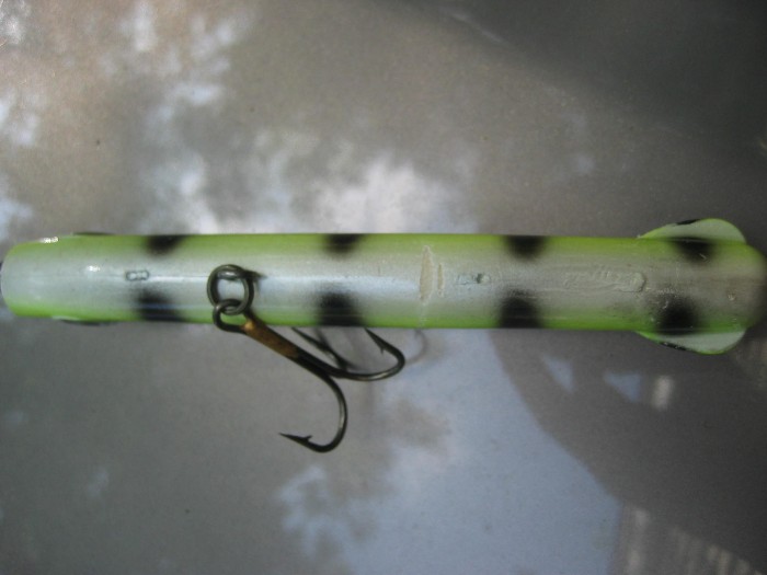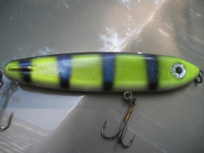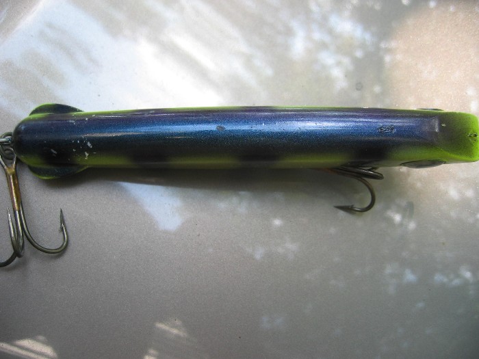 I've got a Hellhound that has seen a little use. Only real damage is hook wear and one or two dings. I'm not sure what the pattern is called, I just had Gregg Thomas pick it out for me. It's a chartreuse, white belly, and irridescent purple bars. Looking for Llungen Tales, Delong Kilr Eels 8", small LowRiders, Big Game twitch baits, SS Shads, custom colored Shallow Invaders, VooDoo Tails. I will try and include pics when I get a chance. Email or PM me.