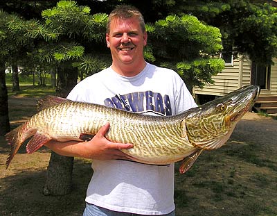 Hartford’s Tom Driscoll cradles his “fish of a lifetime,” a gorgeous 50 1/2 inch, 38 pound Lake Tomahawk tiger muskie.