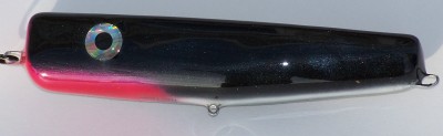 New to the line of Musky Magic Tackle products is the Super Surface Slider which measures 7 1/2" long and is made of pine. What I look for is a lighter wood and it is tail weighted to keep the tail down and nose up. This creates a nose up action and tail wake. For this size walk the dog bait I like two hooks and the placement is one in the tail and one in the front half of the bait. As for the colors black has always been a #1 producer for me. Hope this helps.