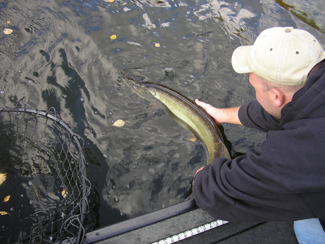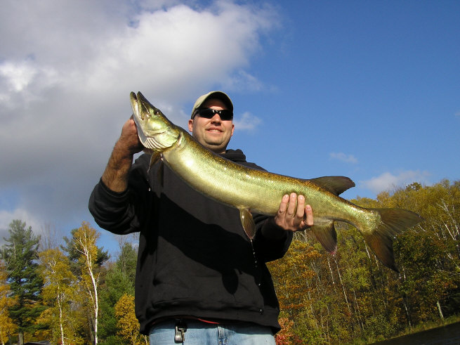 Hired Dave Darozio and hit some action lakes, I got a nice 42" about 20lbs...missed one on a sucker. Buddy got a 35" and two nice sized pikes, no pic of pikes... Dave must not like those fish he just throw them back without even getting a pic, he didn't even want to let us take a picture of the 35". Other wise it was lots of fun and Dave kept us on our toes with his quick witted comments (i got a birds nest on the 5th cast, he said he got a birds nest once back in 1971 when his arm was in a sling). Except for the hurricane winds on Friday and Saturday, the chip was tough to fish, all we got were pikes and some bass. Hit a lot of points, bars and cribs, but depsite us going out on the lake blind, we will be back next year. We did learn a lot for our first time up there.