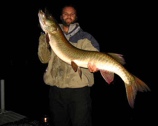 Posts: 189 Location: Hoboken, NJ / North Webster, IN | I caught my personal best 48" muskie on Saturday just after dark in Indiana. Was headed into the dock after a really rough day of fishing(fished hard from 7:30-5p with a total of 3 follows for me and my pops). I decided to leave a sucker out about 30 feet off the pier. Did so, pulled into the shore station and was working the sucker in just popping it occasionally from the pier and it started moving left. Asked my pops to shine the spotlight out and see a tail a good 5 feet behind my bobber. Finally got her going away from me and heave-ho!!! Netted her off our pier, a few pics and off she went. This is now a family best so dad will be hitting it hard to correct that this fall!!! Attachments ---------------- 48_muskie.jpg (32KB - 162 downloads) | ||