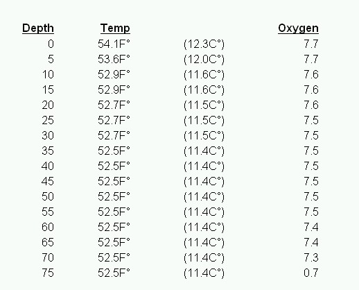 | This is post turnover and if this is Cave Run, in the summer it would show about a 10 degree drop somewhere between 17-25 feet and basically 0% oxcygen at all levels lower than that. |