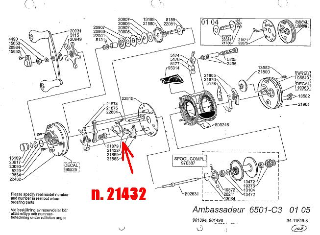 Posts: 66 Location: Padova - Italy | Usually it is the wear of n.21432 part Try to lubricate your reel, try to fish and if the problem persist change or sssslightly bend this part until it engage properly in the gear. I’ve made this operations a lot of times for me and for my clients, especially when we are in some remote destinations. Edited by Luca Cattin 12/27/2005 10:08 AM Attachments ---------------- abu6501c3.JPG (67KB - 175 downloads) | ||