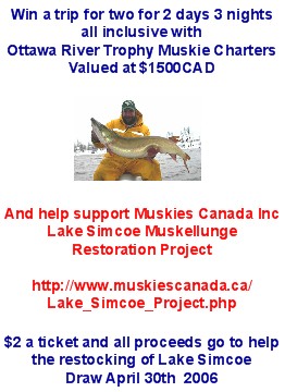 | Jump to page : 1 Now viewing page 1 [30 messages per page] Muskie Fishing -> General Discussion -> See you in PA or IL - Lake Simcoe Muskellunge Restoration Project Raffle TIckets for Sale! |