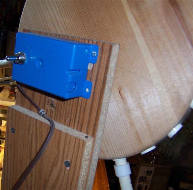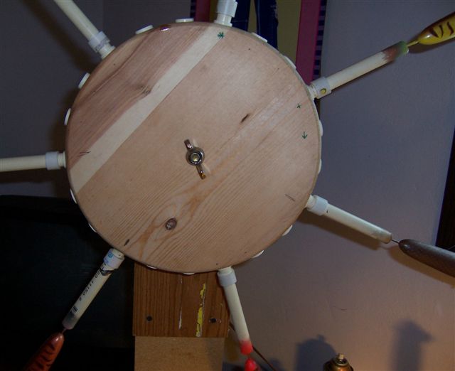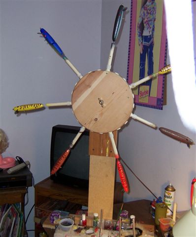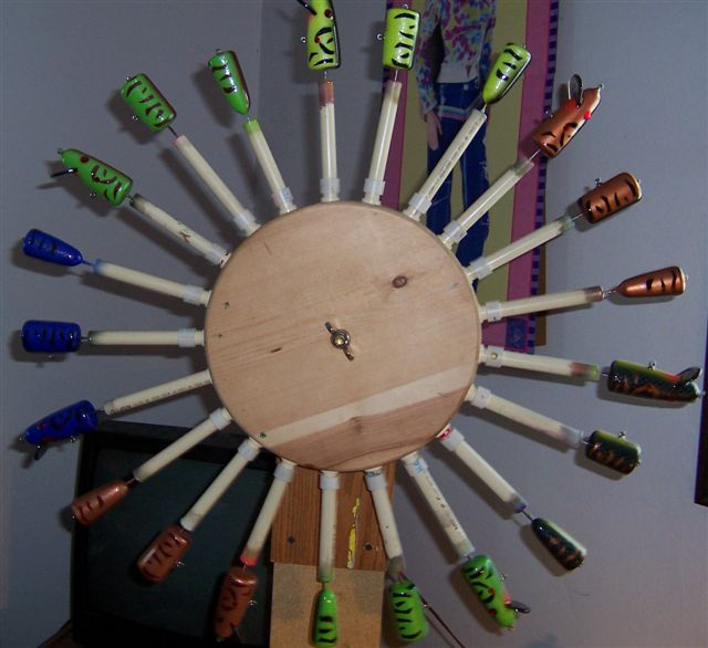 Posts: 2378 | Kenslures - 3/2/2007 9:36 AM Hi there, just thought I would show everyone the drying rack that I made. I like mine turning end over end. The pictures are pretty much self explanitory. If anyone has any questions please ask and I will try to help you out. The motor I use is out of an old micro-wave turntable. Just make sure it is 120 volt. Some are much lower but are marked on the back. I glue a few 2 x 4's together, mark the center and then cut our the circle to whatever dia you want. Then measure around the circle and divide by the number of holders you want to put in the wheel. I use 1/2 inch pvc pipe caps, drill them in and screw off center so they don't turn on you. The holder are made with allagator clamps or nails which go in the tail end of the bait. Just epoxy that one eyescrew in after the lure is clearcoated. Hope this helps you out. How are you attaching that nail to the end of the pvc section? Edited by BALDY 3/2/2007 9:52 AM | ||