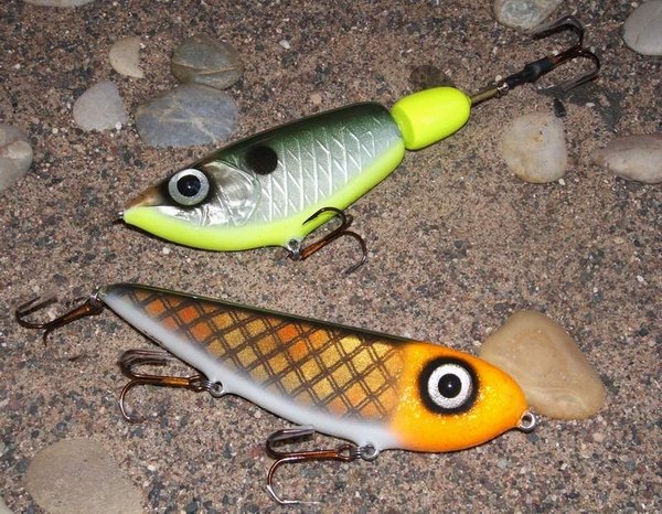 Here's what I use. The walk the dog is a "Trueglide "Heckler" and the prop bait is a Trueglide"Studfinder". The MN. Metro Muskie tournament was wan on the "Studfinder" last year.
