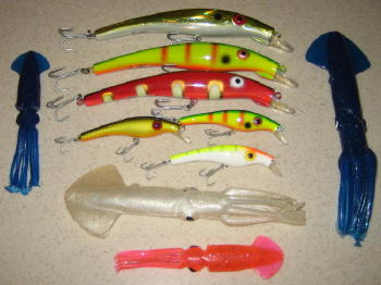 | 3 Trueglides 2 Red October Tubes 2 8 inch HR Hugheys 2 Woodies 1 H20 Nitro 1 Muskie E Glider 1 May Eye 1 Smutly Dog 1 10 inch Jake 1 9 inch Holoform Grandma 1 Magic Maker 1 Custom Topwater 1 Luna casting reel 2 Accudepth trolling reels | |||