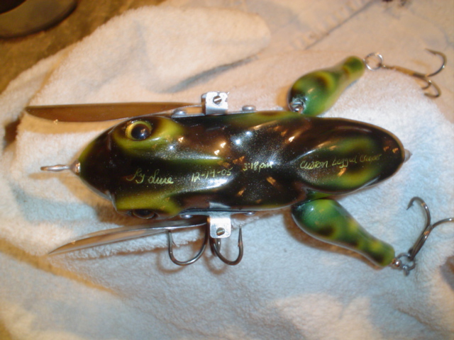 A few years ago I was fishing up on Tenderfoot lake and noticed these huge tadpoles swimming through the water...about a foot or 2 below the surface. So I decided to look around for baits that had a frog or tad pole pattern...I've found very little. I asked Jim Scheaffer a couple of years ago to custom paint an Undertaker for me....Tenderfoot Tad Pole. I've done pretty well with this thing....I wish bait painters would come up with a more realistic frog and/or tad pole pattern.