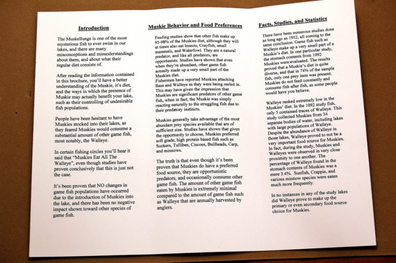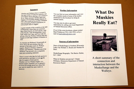 | Thanks for the great responses guys. I'm thinking that even though my Muskies Inc. Chapter may be taking care of the bill for this project, it might be in everyone's best interests to NOT have their logo posted on there. I'm not entirely decided on that though. I'm still tweaking it a bit, but anyone who would like a copy e-mailed to them would definitely be welcome to it. I had noted on the back to contact me if extra brochures are needed, but that could be taken out before I sent it. I also mention that the amount of Largemouth and Smallmouth Bass found in the stomach contents of the sample Muskies was actually LESS than the amount of Walleye found. I think that was about all I had added on that subject, but tonight I planned on looking through the study results further,so I may add another line or two about that. I remember seeing that in one of the study lakes, Yellow Perch accounted for 30% of the Muskies diet. I'm not sure if the Perch fishermen would like to see that figure. Thanks again everybody. | |||