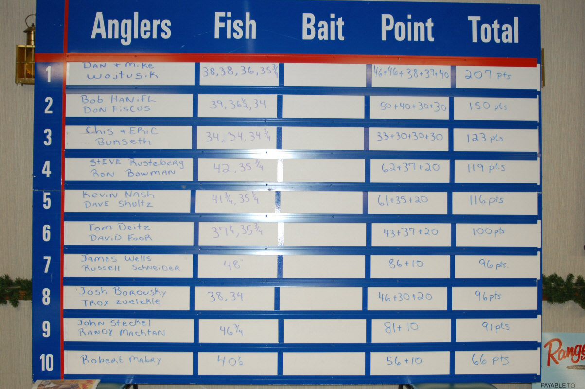 Team 79 of Dan and Mike Wojtusik in first place with a 35,75", 36", 38" and another 38".