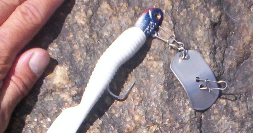 The jigs are mainly minnowhead style barbed collar's prerigged with 8 inch magnum grubs. The blades are military issue dogtags. (yes, they are sturdy) I use a #6 heavy 2x split ring and two #7 duo-locks. (two are required to get the max action)