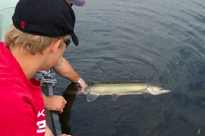 Posts: 5874 | Went up with DaveJ for a weekend of muskie fishing. Added my son Eric at the last moment. Fished hard Saturday with little luck. A few fish seen, and a couple pike, and bas. Fished a new water later Saturday, and I liked what I saw. Raised a couple, but again, no muskies in the net. Sunday was better. Saw a bunch of fish, and Dave got a small one, and Eric got his first casting fish, a mid 30"er, on a Top Raider. Saw the whole thing, and it was nice the fish T-boned the bait. Congrats, Eric! Thanks, Dave. Always have a great time fishing with you. Lots of laughs, even with a youngster in the boat! Edited by Shep 8/14/2006 11:04 AM Attachments ---------------- e81306a.jpg (54KB - 126 downloads) e81306release.jpg (36KB - 130 downloads) | ||