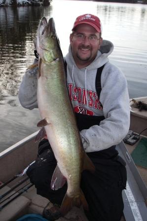 Location: Lake Tomahawk, WI | Had a rough Saturday on the water weather-wise. Brutal conditions to start out, very cold and windy with flurries. Only moved 4 fish, one tried to eat a planer board, but put 3 dandies in the boat. A fat low forties, then 2 at 48.5 and 51+. Mark again got the big one. All fish caught were on deep breaks, hit on big artificials (dawgs and cranks) and are very girthy. Sucker bite has been sporadic from other fishermen I've talked to. Water temps in the high 40's with mild weather forcasted for this week should level off. Also, many big bucks sighted this week as well. A buddy took a big 9, I saw to good 8's fighting, and a giant locked pair shot in Eagle River included a 13 pointer and an 18 pointer. Also a big 18 pointer at 22" wide killed close by. Fall run starting early but will probably back off with mild temps. New moon this week so get out there. JS Edited by J.Sloan 10/16/2006 2:44 PM Attachments ---------------- ML-52.JPG (63KB - 129 downloads) JS-Oct.snow.JPG (68KB - 118 downloads) | ||