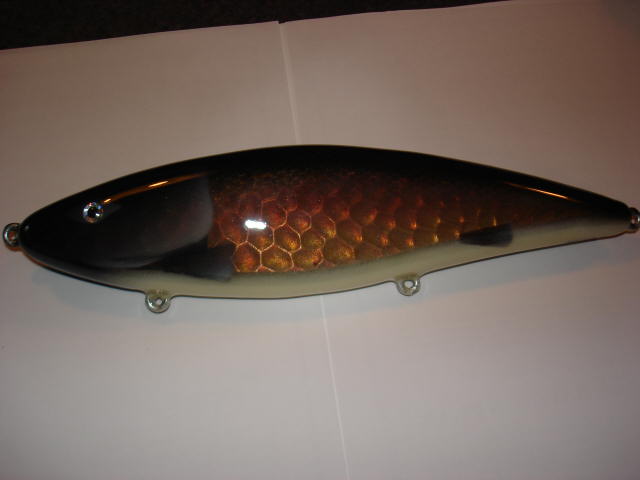 Posts: 399 Location: Burton, Ohio | Hey everybody hope your doing well. finished some new ones up last night. The black one with is well....... I really don't know what it is. I wanted to start a black sucker but it changed into something that looks more like a trout. If you have good names for it now is the time The baits are all 10" long. Not sure what they weigh. I have to get a scale. Have a great day! John Edited by Tigger 10/22/2006 8:24 AM Attachments ---------------- DSC01527thing.jpg (21KB - 117 downloads) DSC01553perch.jpg (22KB - 108 downloads) DSC01548walleye2.jpg (20KB - 125 downloads) | ||