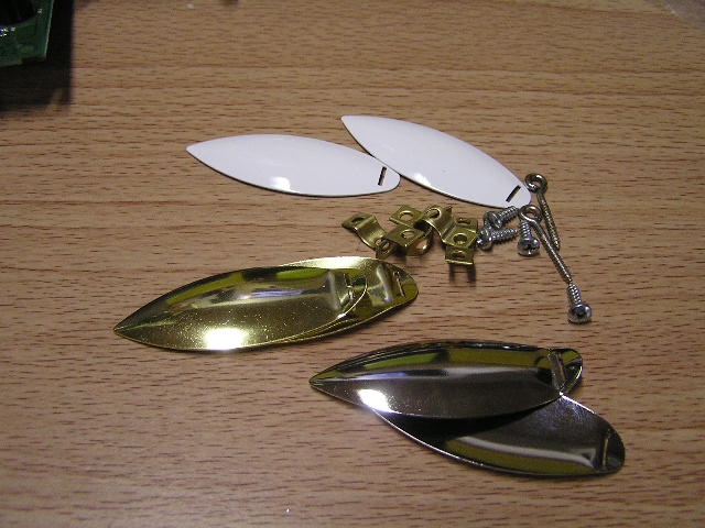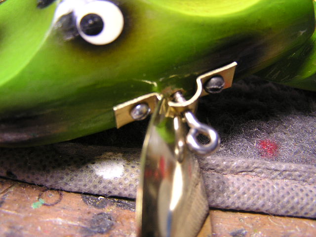 These wing are available in Brass, Nickle, and Nickle/Paint. The brackets for mounting are made of Marine brass, the screws are zinc coated and the screw eyes are Nickled Brass. I have taken a a production bait purchased at R&H, I took off the old wings and put these new wings on in their place and took a jaunt down to the old river to test them out. It took me about 4 casts to get them tuned the way I like them to act and sound but everyone's choice is a bit different. I am including a little tuning guide with these just in case someone needs help to get going.