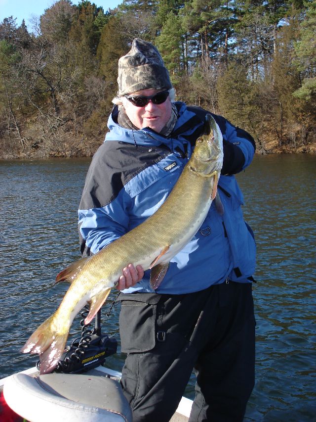 Posts: 2865 Location: Brookfield, WI | Had to do a little fathering yesterday, but I'm back now. Left the house yesterday morning about 5:30 encased in poly pro and layered in fleece to put Plan I into play with my tall friend Joel. By 6:15 sucker procurement was completed, and by 6:30ish we were under power and heading out onto Okauchee. Initially the day was going to be devoted to The Light Touch with Sensei Joel providing the lessons. It was over the side for three of the suckers Joel had drafted for duty at Muskie Mikes. We chatted and I decided to watch the suckers instead of casting. Joel casted on a semi regular basis explaining the workings of several gliders. The morning wore on. We were warmed by great conversation fueled by a couple of CC's and several snorts of Jager. While the two of us were extolling the various joys and benefits of fatherhood, we were really starting feel quite warm LOL, I glanced over and noted a slight bouncing of one of the rod tips and the line began moving. Joel says "that's a fish." Rising from the seat I took the rod up to the front deck, reeled down, and gave her a hook set that did not fall in the gentle category. Joel's thinking maybe we have something nice happening, but I expressed some initial doubt. That sentiment appeared to anger the fish enough to thrash quite violently and show herself. Then we got a little excited, with Joel shouting guesses of least 45". I calmly, if I say so myself, kept the pressure on, reeled her to boatside, and in the net she went. She was nicely pinned right in the corner of the mouth, Joel unhooked her, up she came, a quick measure of 47.5", and the photos taken. She thrashed out of my hand powerfully as soon as I layed her in the water for a quick release. Thanks to Joel for having a camera, as the battery was dead in mine. Doh. I should mention she protested the short photo session by crapping in my drink, but I don't hold that against her. It only took about fifteen minutes for the slamming in my chest, the shaking, and the panting to subside. LOL. Bigger muskies are just that much more fun. If this becomes the closure for my first year of musky fishing, it couldn't be cooler. The fish was caught not ten yards from the 32" I got with Joel as my very first musky last June in the IMTT. I will always fondly recall the area as "our spot". There were seveal more snorts of Jager taken in celebration, and I was very glad to be able to have lunch with Andrew, Magruter, and MuskieMike at the Hideaway. Very cool to have one of my other M1st mentors there as well as Joel. No other action for the day, though Joel did a little yanking of the chains of the other boys in that regard. Joel, what can I say? You rock. I really want to thank the sucker, by the way, The sucker that eventually offered itself up for my benefit, had been a little balky at first, showing its belly, not swimming much, etc, but in the end took its job quite seriously, thank you. Here's a few pics of the 47.5" that came from "our spot". Kevin Plan I Attachments ---------------- October fishing pictures 007.jpg (117KB - 110 downloads) October fishing pictures 008.jpg (163KB - 97 downloads) | ||