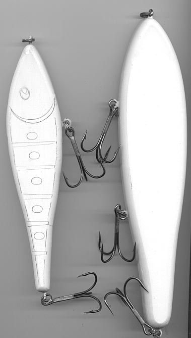Posts: 4266 | Gotta send out a big thank-you to the guy who makes my blanks. I told him that I wanted to do a 10" lure, but I would like to keep some charachteristics of the 8" Perka body. Well he came up with a beauty, and after a day of playing in the aquarium, I weighted, balanced and primed one blank and went to the yacht club dock this morning. I was using a 6'9" St Croix, so I really couldn't twitch it to make it move, but a bit of a "tug" would be more appropriate, and it took off about 2' to the side and slowly sank and shimmied as I watched and then another tug sent it moving in the other direction with an awesome roll, then it stabalized and began to glide until I let it pause and shimmy on down again. Then I tossed it out and gave it a faster retrieve, and it came in just under the surface until I hit the brakes for a second, and would keep on going and then sink until I started it moving again. Going to be busy over the winter, but it'll be worth it when you guys get the urge to throw some big stuff. Pardon the lack of paint job, I am just excited to finally have a 10"er that looks like part of the family. I'll post some finished products when I get around to painting. Right now I'm heading back in the basement to weight the rest of the prototype bodies. Beav Attachments ---------------- Regular and extra large.JPG (23KB - 182 downloads) | ||