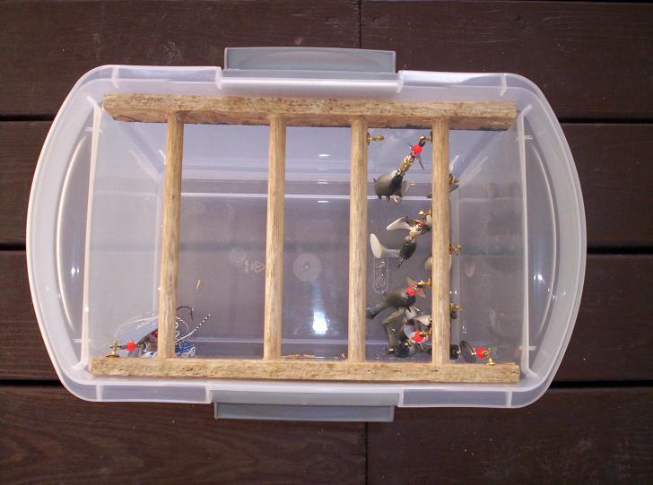 Posts: 119 | I like the idea of no bottom on the box, so you don't have to reach into a pile of hooks to grab a fallen plug! | ||