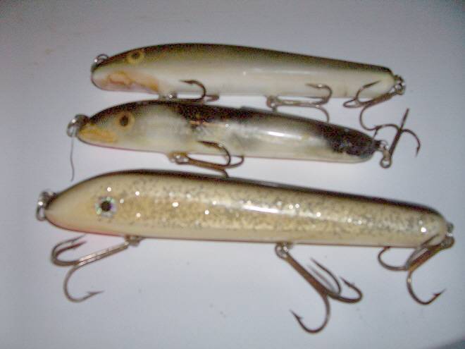 I've had these baits for a pretty good while and don't know who makes them. I would like to have more of them. The top one appears to be made of maple, the second a very tight grained wood(maybe cedar) the third is in almost new condition considering its age. They are all good lures and I love their actions. So if anyone knows who makes them and where I can find them let me know. thanks ahead of time, Danny