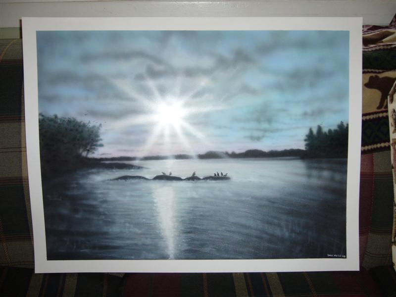 Posts: 680 Location: Muskoka Ontario,Canada | Hey folks, I just finished a new painting which doesn't feature any fish but was done to try to get a grasp of doing the backgrounds we see in many musky paintings. No where near perfect for sure but I sure had fun trying new techniques out. I really utilized the control of my newer Iwata Micron and Hi-Line airbrushes in doing this piece. In particular the mist drifting across the darker areas where tricky to do without that added control. When you see the actual painting, the sun and sunbeams are done with a pearlescent paint that really "shines". Cool effect that will look great when applied to the underwater scenes I prefer to paint. Edited by Musky Snax 3/23/2007 6:45 AM Attachments ---------------- P1010677 (Medium).JPG (47KB - 174 downloads) | ||