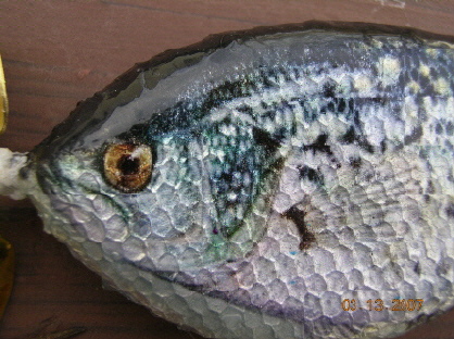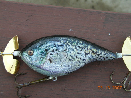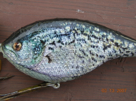Posts: 680 Location: Muskoka Ontario,Canada | If I'm not mistaken that is a photo finish of a crappie ovelaid onto the foil? What part is actually painted? That aside, it obviously looks really good. My only advice at all would be to not have the scales on the head as it detracts from the realism. Other than that it's an exceptionally nice looking bait. Congrats. | ||