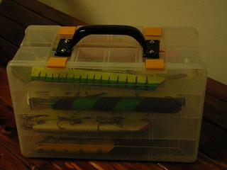 Posts: 56 | More photos of the bucktail box. The spacing of hooks was arbitrary. Nine down each side. Then I alternated the middle bracket from side to side. I also made a simple big bait box bolting two plano 3730's then found a perfect handle to bolt on top. Great for 10" suicks or even home made 12" suick like baits. Attachments ---------------- bucktail box10.JPG (12KB - 266 downloads) bucktail box11.JPG (12KB - 265 downloads) bucktail box12.JPG (17KB - 310 downloads) big bait box1.JPG (15KB - 258 downloads) big bait box2.JPG (16KB - 246 downloads) big bait box3.JPG (16KB - 264 downloads) | ||