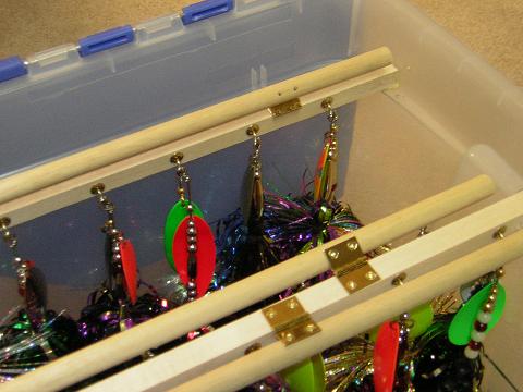 Posts: 786 Location: Minnesota | Dutchman, I like it! Can you take another close up pic of one of the ends? Just seeing how you secured teh dowels to the edges as well as the hook arrangment to hang the lures. Thanks, James | ||