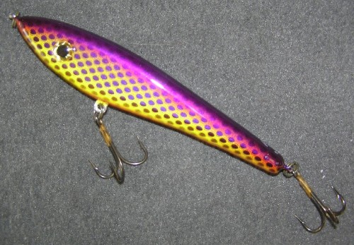 | there's a lot of high-art baits being produced, with some amazingly realistic stuff being posted in this forum. there's been a few comments and questions about whether or not they would/should be used to actually catch fish. i'll leave that to everyone's personal preferences. for me, i like some contrast and some brightness in my lure selection when they're actually going to be used to catch fish. this Perkette i just got is about as good as it gets. nice job, Beav! Attachments ---------------- perkette1.JPG (69KB - 104 downloads) | |||