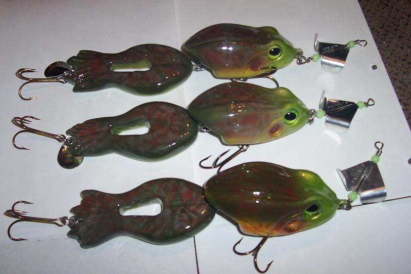 Decided to sell six of my frogs. Topwater frogs, have three big Bullys for sale 9 1/2" long (13 1/2" blade tip to blade tip length) 5 1/4 oz, basswood,prop dip sealed 3 epoxy topcoats, heavy duty split rings 2 5/0 trebles. $ 50.00 each. If interested please let me know. Second set of baits are medium sized Bullys 8 1/4" long, 4 oz shallow divers, basswood, prop dip sealed, 3 epoxy top coats, 2 5/0 trebles done in a nemo pattern, northern leopard frog and a tequila sunrise pattern. $40.00 each. If interested please e-mail or pm me.