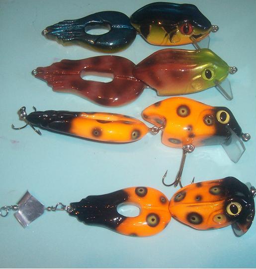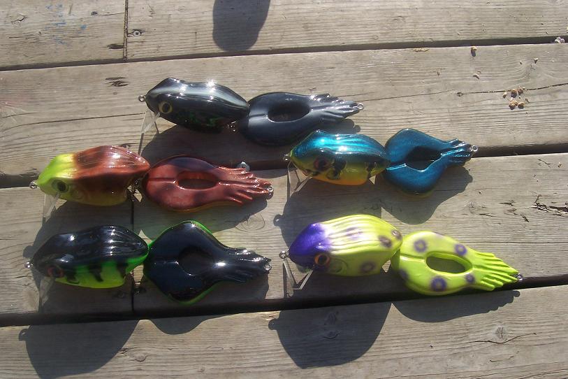 Have a few more frogs for sale if anyone is interested. Basswood sealed medium bullys are 8 1/2", big Bullys are 9 1/2". Epoxy top coats, heavy duty stainless steel screw eyes/split rings. 5/0 trebles. Float at rest, dive to two feet when cranked in.