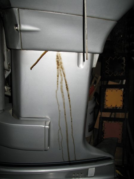 I went to pick up my boat from storage (Inside an attached garage), and found some brown fluid dried up on the side of my engine. After trailering home, I noticed a little more leaked out.