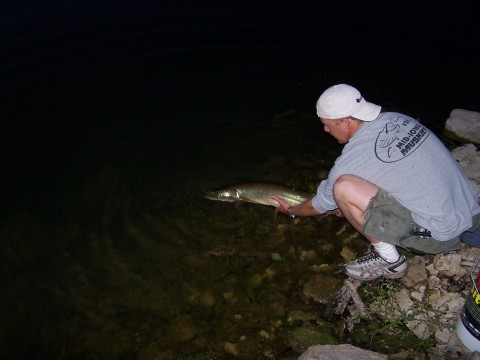 Posts: 785 | YOU GUYS ROCK!!! Some guys from M.I. (not sure what chapter) have also been doing the same at three mile lake, last I knew one guy had transported 12 fish alone with one measuring an impressive 50"es. My causin was there a little while ago and rescued two but he said there were like 8 more they seen but were unable to catch in the time he was there. It is so important to the fishery that you guys keep up the good work becouse the mid summer temps and catfisherman will kill lots of them otherwise. I am working on a draft letter to the Iowa DNR, in our last meeting with them they were just on the deffensive and so far haven't showed any interest in improving the musky fishery. I'm not sure why its ok to keep a 30" musky below a spillway but not ok to walk it 80 yds up a hill and let it back into the lake!!!!!! If thats illegal than I volunteer to be illegal anyday for the sake of our fishery, and good job on the education, I told some people at 3 mile that they taste horrible so there releasing some now also. | ||