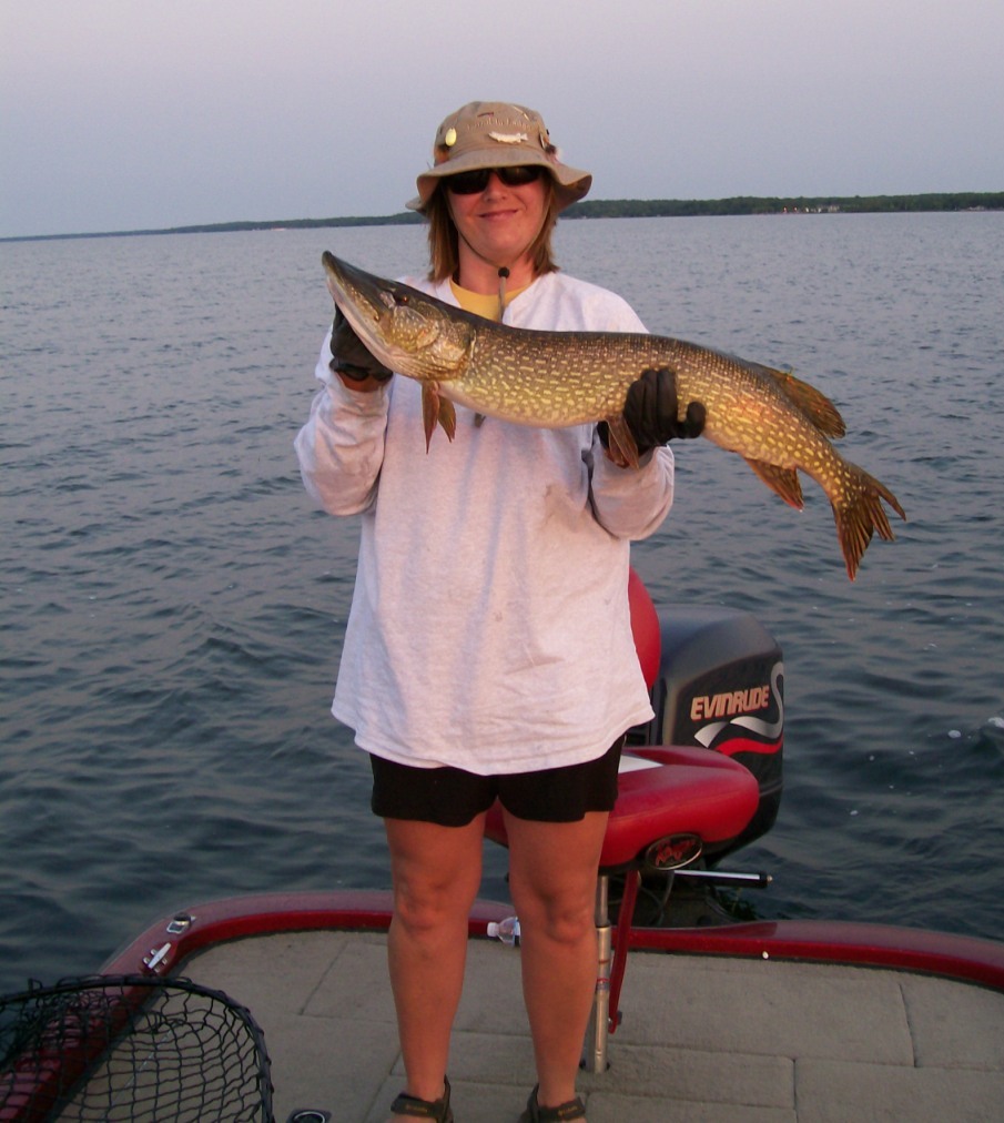 Posts: 216 Location: Elk River, MN | I just saw that Kim posted this. As follow-up, the lost rod and reel was right at the boat at dark, so there was very little line out of the reel. Also, the "buddy" who let the rod fly out of his hands is a "professional guide" but I won't name names - but Gregg said he had caught a lot of grief about it. If I remember correctly, we were fishing in 11' of water with weeds so the odds had to be pretty slim that one of us would hook it. lf she would not have caught the fish, it would probably have not made it another day. When we released it the first time, the fish was swimming on its one side and flipped belly up. Gregg worked it again and it was very fortunate to have successfully released the second time. As she mentioned Gregg is a class act, very very professional and educational in the boat; and we had a blast. It woudn't have mattered if we caught fish with him or not, it was that much fun. Gregg is almost 11 years younger than me, but is so knowledgeable on muskies he is doing exactly what he should be doing, guiding for muskies. | ||