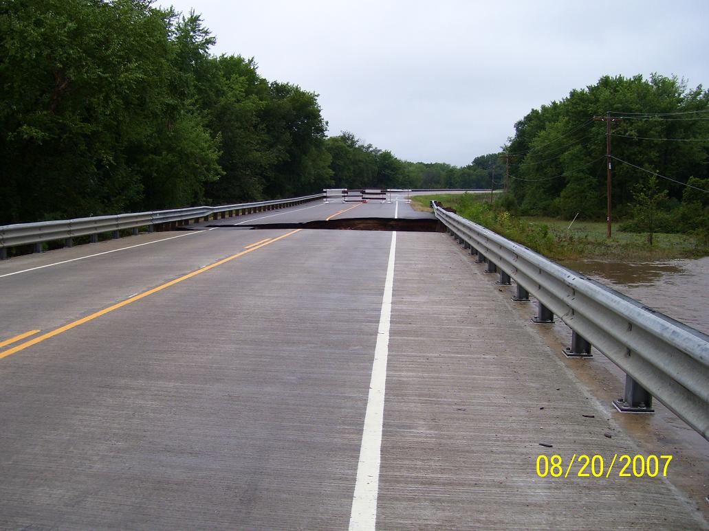 Location: Madison, WI | Here's a picture of a bridge just west of Muscoda WI, I'd hate to be the first person to drive up to it! There's 2 more bridges that are out along the river in this area. Not to mention about 500 ft of road. 8 inches of rain on saturday + more to come.
