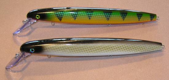 Posts: 35 | Thanks for your interest with the big foot lures. What we wanted was a 12 inch bait, so we put the regular DR which is 9 inches tip to tip on a cad. from there the Bigfoot was made up 30% larger than the regular Dr. The shallow raider was done the same way but because of the skinny profile on the regular shallow raider we made the bait thicker in the middle. The diameter of the bigfoot dr is 4.5", the big foot shallow raider is 4" and the regular Dr is around 3.5". The baits have a real nice wobble to them. The BFDR really digs down deep, I had it hiting bottom of the Fox River 24" deep with about 60 to 70 feet of line out, it will go deeper with more line. The shallow raider gets down around 10 feet with 60 to 70 feet of line out. This bait worked great trolling the shallow banks & flats of the river & bay this year. Hope this helps. | ||