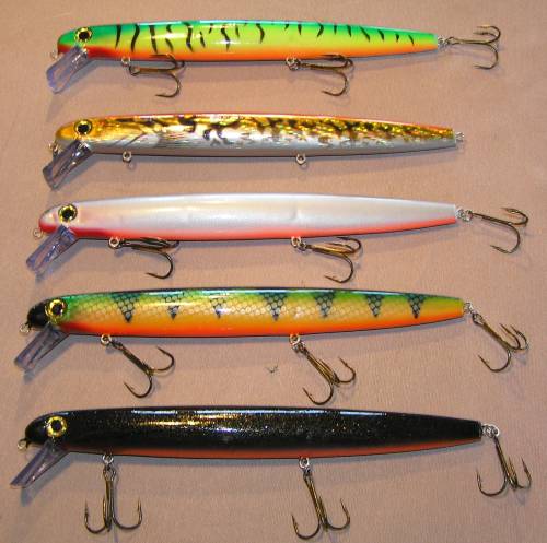 | the circumference of the straight bigfoot d-raiders is much larger than that of a normal d-raider, but not huge. my impression was that this is a bait with a big profile that will still fit in a fish's mouth and "slide" through the bite to help with hookset. i wish i'd taken a pic with a regular d-raider for perspective, it'd show the size difference better. consider the fact that the lures are 12" long from tip to tip. the shallow raiders appear more "skinny" as they're only slightly thicker than the standard s-raider. they're size difference is in the length and the height instead. of course, the bottom line isn't how they look in your hand, but how they look and run in the water...i'm betting the pool demo at the winter shows will draw a crowd. | |||