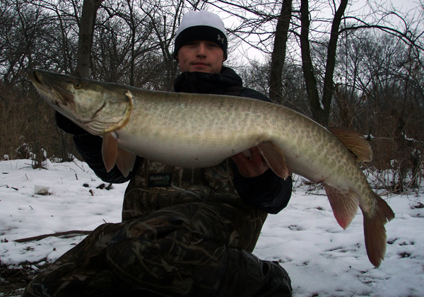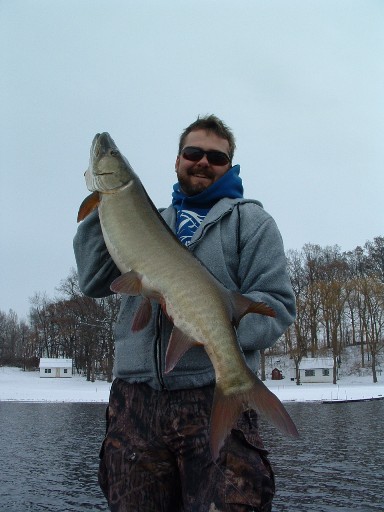 Posts: 231 | Reelwise - 12/13/2007 11:26 AM Fished for an hour Saturday with fish4life and didnt see a thing. Went out Sunday for an hour and a half to a spot I told esox50 I knew a couple would be and had action from 3 fish in about 25 minutes. Landed a 46.5", 33", and lost one "waderside" that probably would have gone 35-36". All action came around 4:15-4:30. New moon, sunset was at 4:25, and the only time of the day the pressure was rising was around 4:25. Finals are over! Beautiful fish, Brandyn! Congrats on a pig! Chas | ||