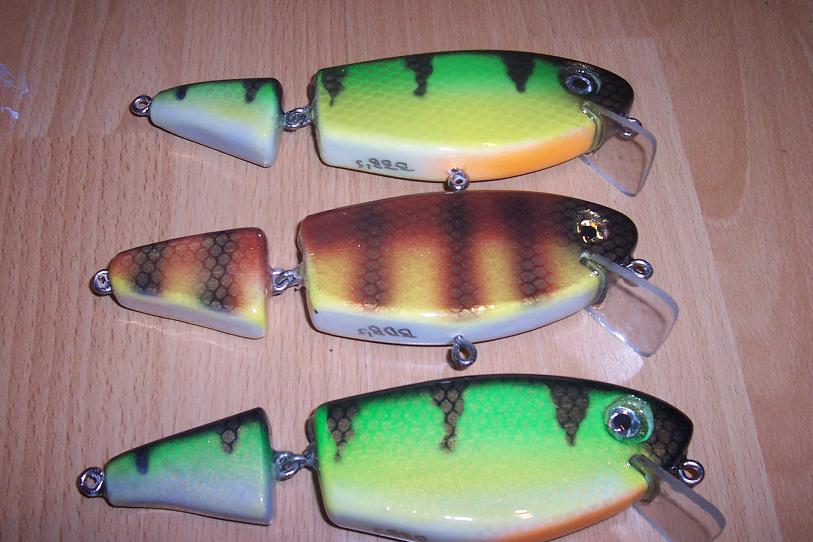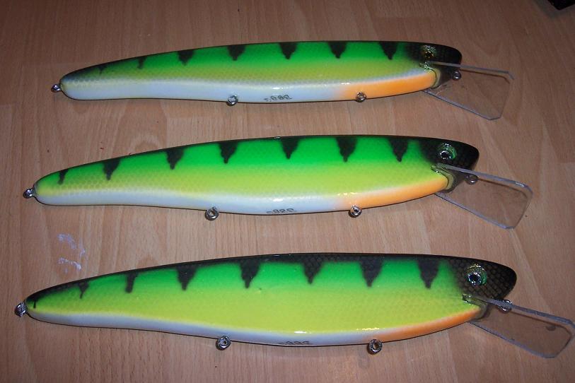 Posts: 309 Location: canada | Hi Guys Thought I'd show some new baits. I call them Jackhammers, smallest guys are six inches, 6 ft deep max can be slow trolled at 3.5 mph. As well as some 14" guys, just over 6 oz, straight guys will do 10 ft at 2.5 mph & 22 ft at 4.5 mph. Jointed will do 8 ft at 2.5 mph & 17ft at 4.5 mph. Special thanks to Woodie fot being my proto tester. Hope you like them Thanks Etch Attachments ---------------- 100_1138.jpg (71KB - 122 downloads) 100_1139.jpg (60KB - 125 downloads) 100_1140.jpg (57KB - 117 downloads) 100_1142.jpg (61KB - 136 downloads) | ||