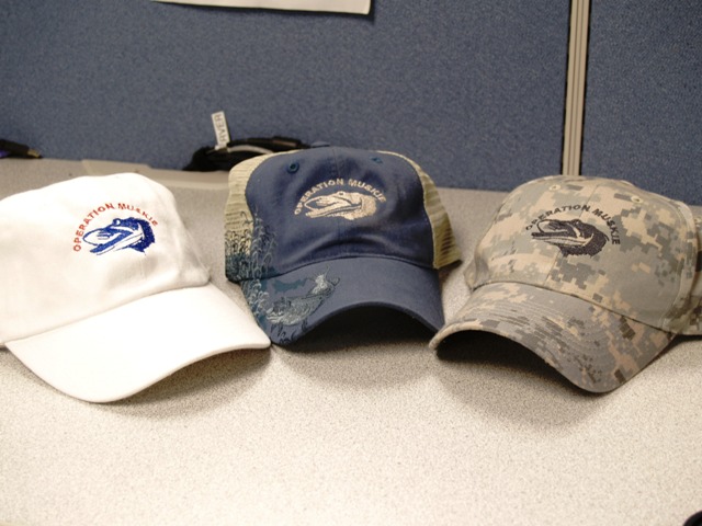 Here are the 3 hats that we have come up with for Operation Muskie.  Something for eveyrone.  The blue hat has a muskie embroidered on the bill with the cabbage embroidered down the side.  Velcro fasteners on all of them.