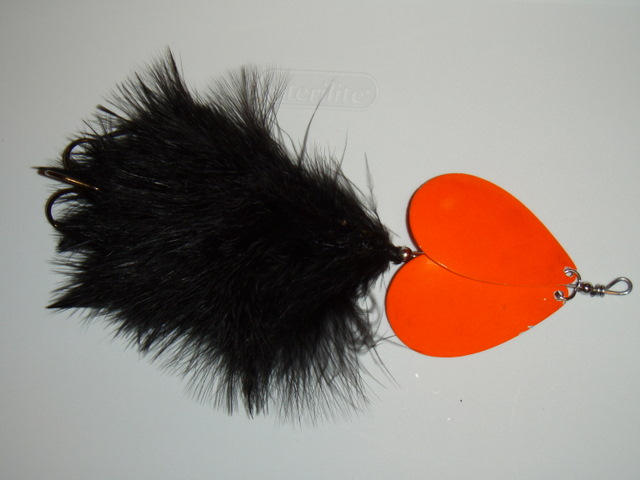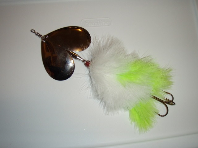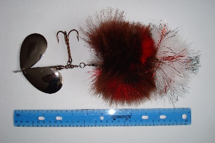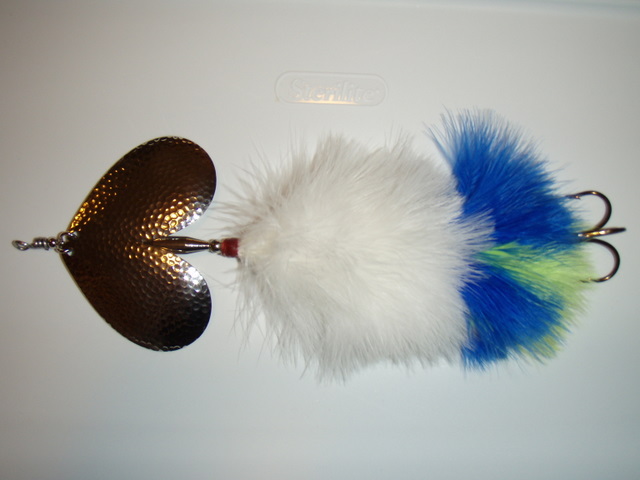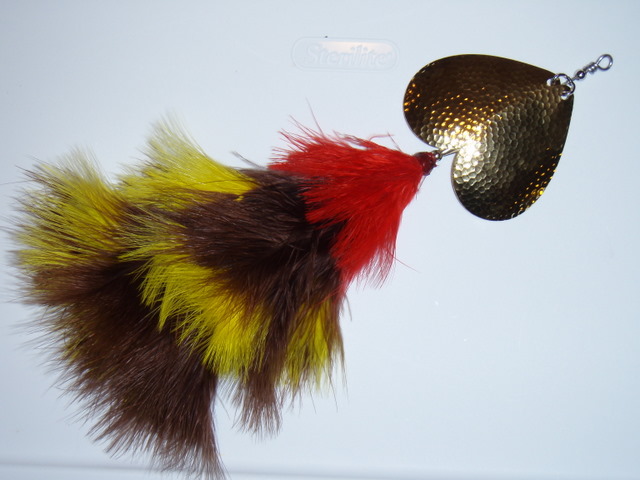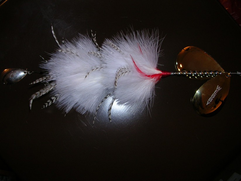 Posts: 82 Location: Owatonna,MN | Here is a marabou/hackle combo I tied. On these with 10 blades I use .062 wire. On the smaller ones I use .051. I also added a teaser blade to this one for a little added attraction. I tie all to coil I get from either cheap drain cleaners (drain snake) or lawn mower throttle cable. I use course thread that I get from Moore's. Good luck. Scott Webster www.michapter54.com Attachments ---------------- June 2 004.jpg (82KB - 110 downloads) | ||