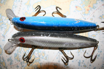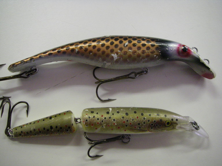 Posts: 1764 Location: Ogden, Ut | Here's 4 baits that accounted for over 40 fish this year. The Rapala is in amazingly good condition considering that it boated 18. The fish tended to hit the Baby Wabull rather violently and 13 fish hit the net with it in their mouth. I also lost several that hit the Wabull, but due to operator error, they were released prematurely. Oh, by the way, it was originally perch colored! S. Attachments ---------------- IMGP2197_resize.JPG (102KB - 182 downloads) IMGP2198_resize.JPG (94KB - 180 downloads) | ||