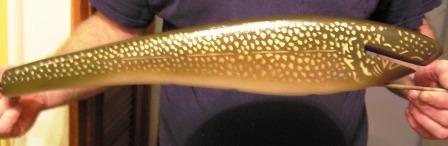 Posts: 1106 Location: Muskegon Michigan | My Lake trout is good but not exact with fins and such. The spots however are taken from an actual photo traced and cut out with an exacto knife then stenciled onto the body using a chameleon gold paint. here is a pattern on a 21 inch Deepthreat body. This was taken before assembly and clearcoating. The shades of olive can be lighter or darker depending on your preference. Mike King Attachments ---------------- DEEPTHREAT 21 INCH.JPG (13KB - 180 downloads) | ||