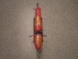 Location: Hastings, mn, 55033 | I have 2 globes and 2 toppers for sale. All baits are hand turned one at a time out of either red or white cedar. Stainless steel .062 main shaft with soldered loops on the ends. "Paper clip" style metal hanger connecting belly hook to thru wire shaft. Brass tubing in belly hook holes and in the head of the globe lures. Top quality primer/paint/epoxy top coat. Glass eyes in the toppers along with brass musky munk blades front and back. VMC cone cut hooks. All baits are signed.