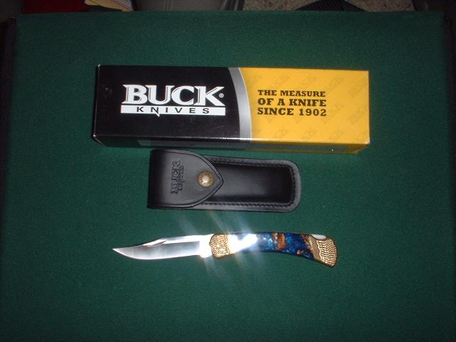 For you hunters, or guys that just like knives, here is a buck 110 customized by Michael Prater. It has mica pearl handles in midnight blue and gold. This knife is sharp, and basically sat in a drawer.