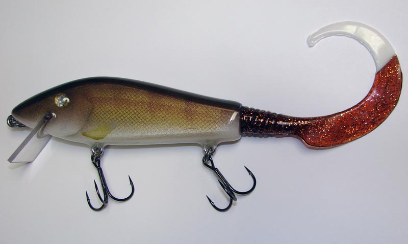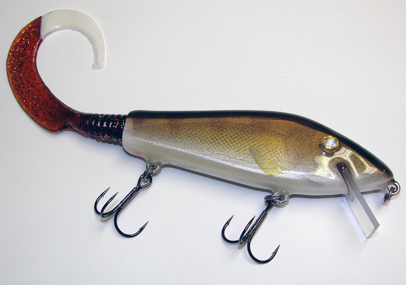 Here's a new bait a buddy and I created this winter. He makes them and I paint and finish them. 6" long body with rattles and about 12" total length with rubber tail. PA fish seem to really like shallow cranks with the plastic tails. This is the first one I painted in a Walleye pattern with a custom plastic tail.