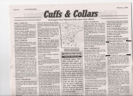 Posts: 79 | this is from the Mn DNR web CO Jackie Glaser (Mound), along with CO Kahre, interviewed a fisherman who caught and kept a 52” muskie in a closed season from Lake Minnetonka. After several office phone calls and TIP calls regarding this muskie, COs Glaser and Kahre were able to locate the fisherman based on photos from the Internet and seized the muskie. CO Glaser also worked on background investigations and attended an EMT conference in Duluth. | ||
