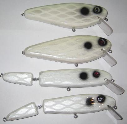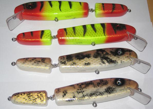 Some new baits I just finished. New style ducks with big maple keel, super stable and great action. 6" jackhammers done in new paint patterns. Jointed bombers and small mini bombers. Hope you like them.